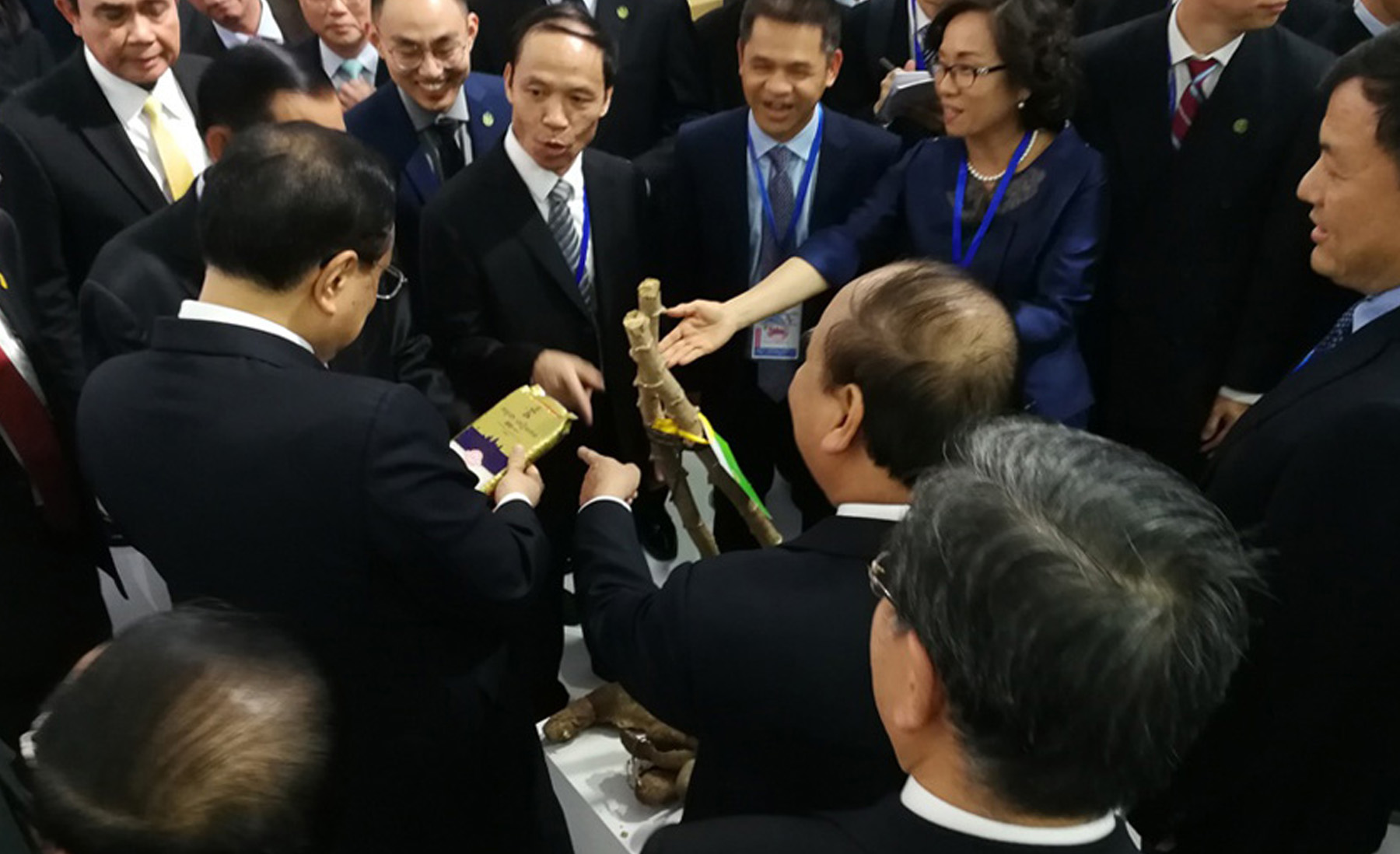 1月10日瀾(lán)滄江湄公河合作成果展在柬埔寨金邊開幕,國宏集團公司生產(chǎn)的暹(xiān)粒牌柬埔寨茉莉香米亮相展會,當日,我國國務院總理李克強在金邊與柬埔寨首相洪森(sēn)、老撾總理通倫、泰國總理巴育(yù)、越(yuè)南總理阮春福、緬甸副總統吳敏瑞共同參觀瀾滄江湄公河合作成果展。六國(guó)領導人在參觀成果展中,在(zài)國宏集團公司生(shēng)產的柬埔寨茉莉香米展櫃前駐足觀賞,聽取李旭香副會長對產品的介紹。