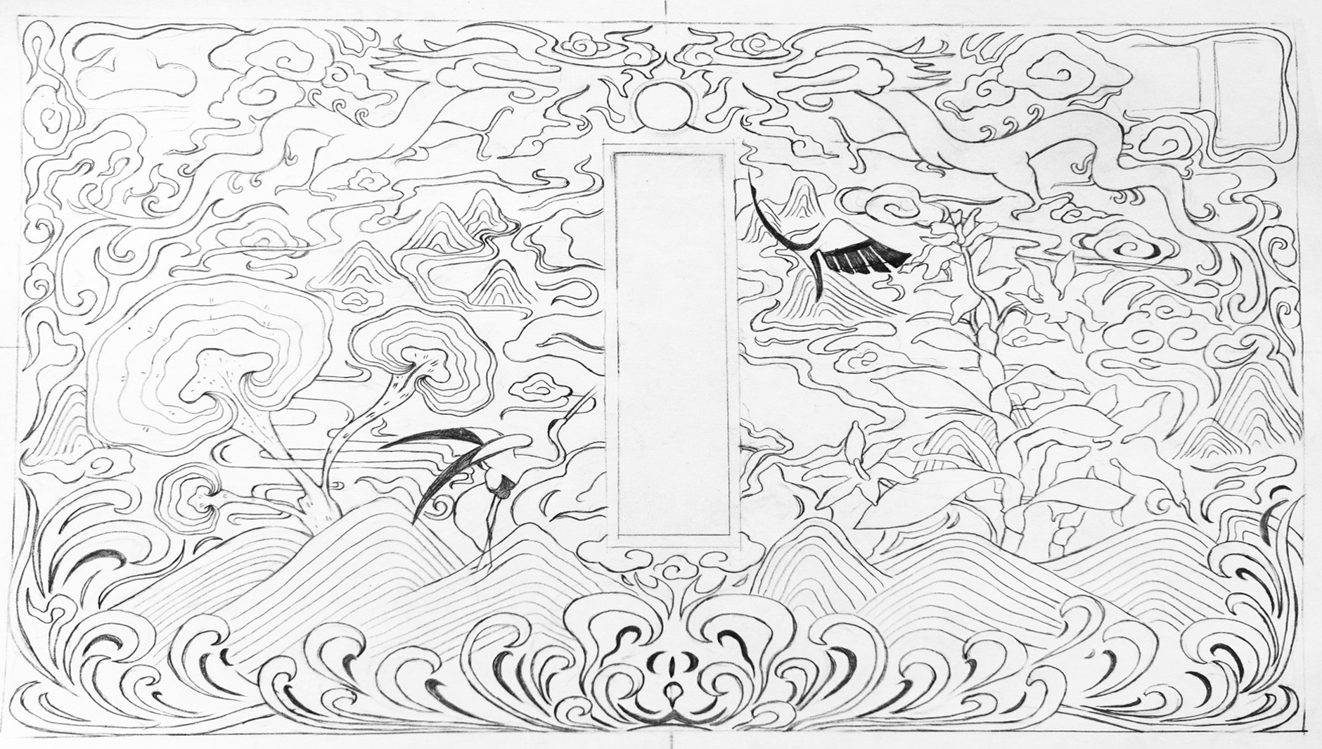 山脈、流水、仙鶴、水紋