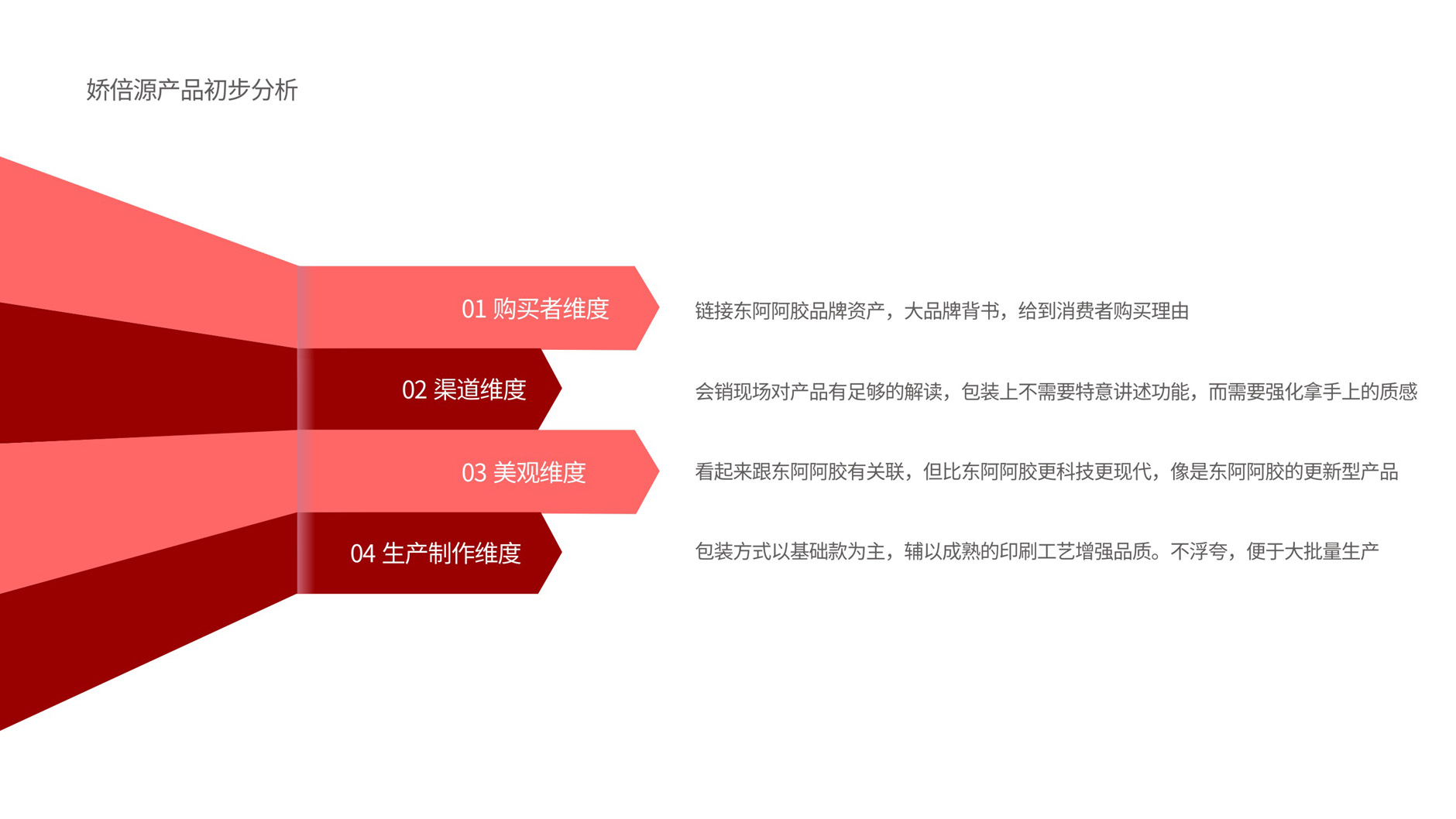 嬌倍(bèi)源作為滋(zī)補行業頭(tóu)部品牌(pái)——東阿阿膠的子品牌,如何處理好與主品牌的關聯性?目前的產品係列,或因功能不同,外包(bāo)裝設計(jì)呈現出各自為戰(zhàn)的狀況,怎麽合理的(de)規劃產品調性,凝聚產(chǎn)品的視覺力,既能夠有一定的(de)統一調性又能呈現出單品的(de)個性?如何承襲運用好主品牌的品牌優勢?