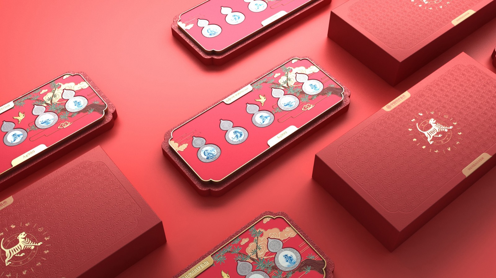 五福(fú)同堂為走量產品,售價起點較低,風(fēng)格要為大眾所接受,以(yǐ)傳統新年喜慶歡(huān)快(kuài)的(de)氣氛為主調,采用相對常(cháng)規的包(bāo)裝形式,便(biàn)於控製包裝(zhuāng)成本。